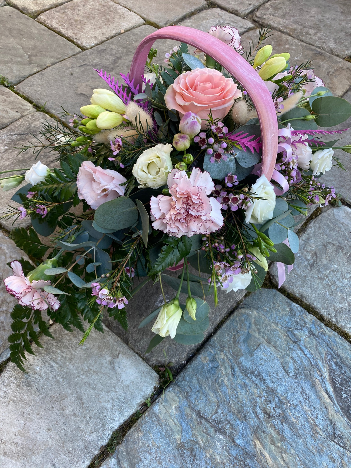 A beautiful basket arrangement of seasonal flowers for mum on Mother’s Day.